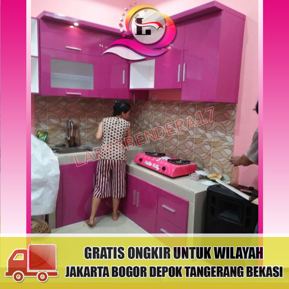 Jika diperhatikan pada desain dapur warna pink di atas, hampir seluruhnya menggunakan kitchen set.